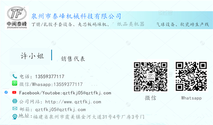 泰峰一如初心,始终致力于生产丁腈检查手套生产线、手术手套生产线、家用、工业用的乳胶手套生产线、劳保手套半浸胶机、袜子浸胶机、PVC手套点珠机、夹芯板码垛机、口罩机、手卷纸折叠机、卷纸上胶印刷上胶分切一体机、面巾、餐巾、卫生纸生产设备,乳胶气球生产线和气球印刷机等机械产品。花香蝶自来,公司严抓产品质量关,重信誉,先后通过了CE认证。数年来的发展深受客户的信赖与赞誉,产品不仅销往国内大部分省份城市,还远销西班牙、埃及、哥伦比亚、日本、南非等多个国家及地区。