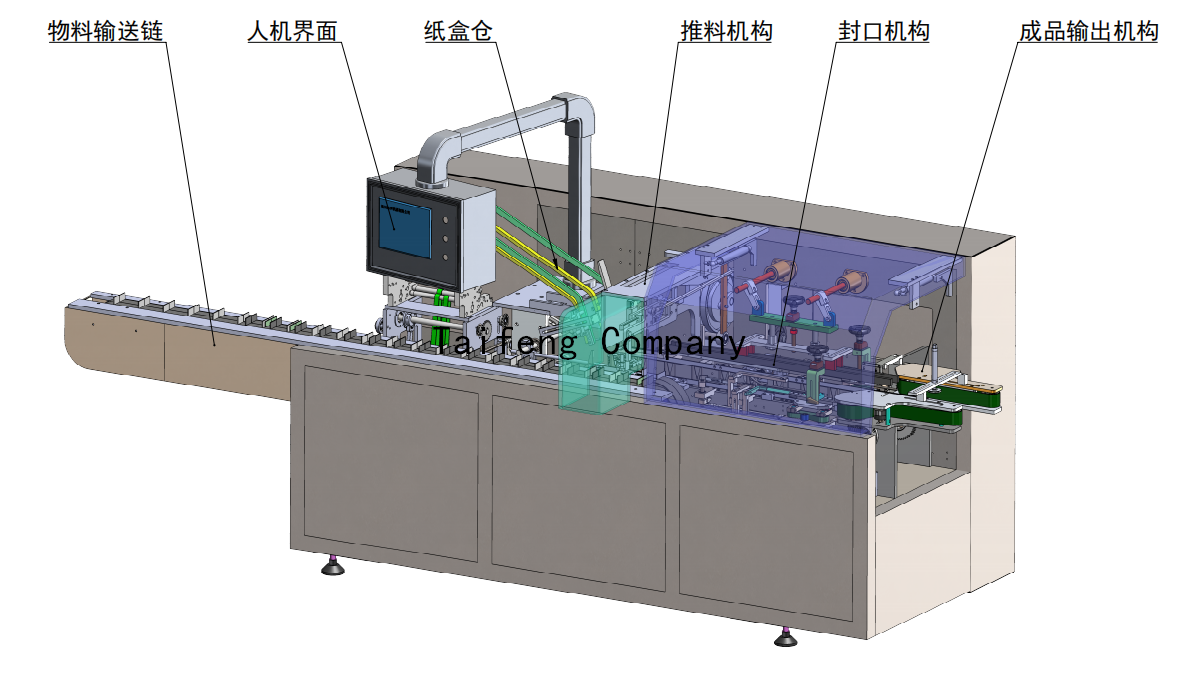 卧式自动装盒机是集光、电、气、机一体化的高科技产品。适用于多种产品自动装盒。其工作过程为物品的传送;纸盒自动撑开与传送,将物料自动装入纸盒内;并完成两端纸舌等繁杂的封装过程。该机外形全部采用304不锈钢罩壳,严格按医药行业“GMP”标准要求行行创新设计。传动部分设计了过载保护功能,并设置了急停装置,操纵系统采用人机界面视屏,保障了操作者的人身安全。